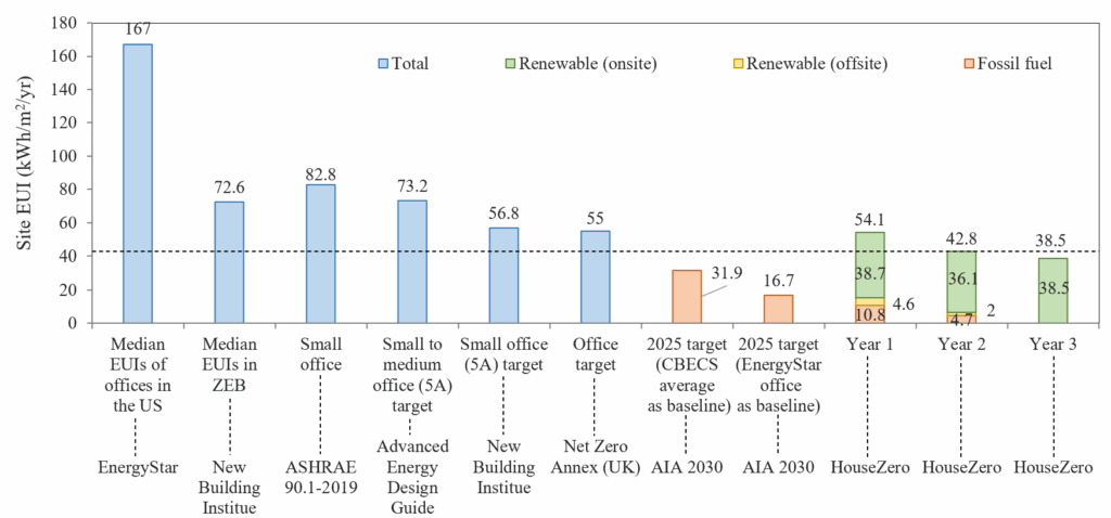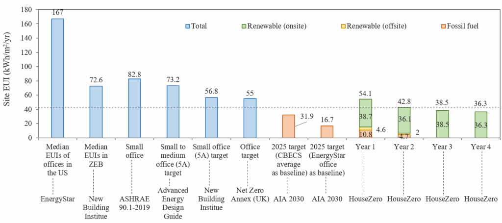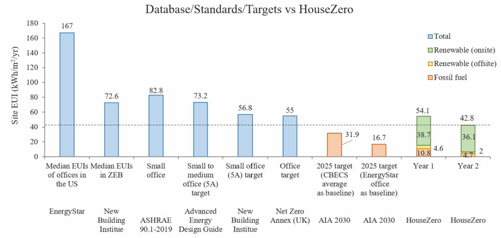 Advanced Energy Design Guides, led by the American Society of Heating, Refrigerating and Air-Conditioning Engineers, proposed a target EUI of 73.2 kWh/m2/year for small to medium offices at 5A climate zone. Net Zero Annex (U.K.) and New Buildings Institute also provided two more aggressive targets, i.e., 55 kWh/m2/year and 56.8 kWh/m2/year, respectively. HouseZero currently meets these targets.